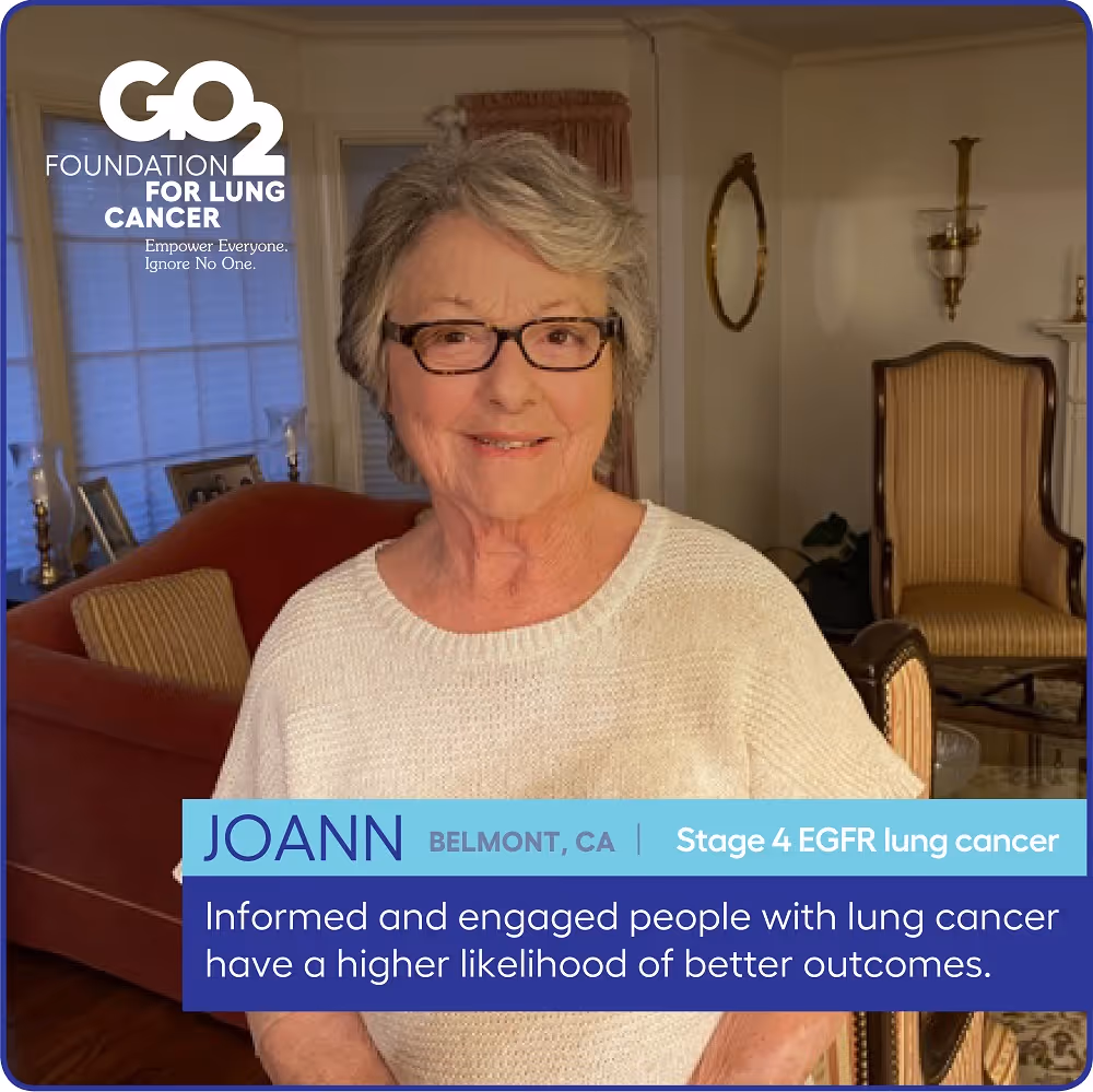 JoAnn Berridge was misdiagnosed, repeatedly. Doctors thought she had allergy-related post-nasal drip; then they thought she had acid reflux. After a year of trial and error and a persistent cough, her primary care physician ordered a chest X-ray in September 2016 and found a 5 cm tumor that had metastasized to one adrenal gland and several places in the bone. Following comprehensive biomarker testing, she was diagnosed with stage 4 EGFR exon 19 lung cancer. Her oncologist was supportive from the get-go and told her, “You are healthy, you are vital, you are active. This is going to go a long way toward helping you survive this.”We talked to Berridge about her involvement in the lung cancer community, including her participation in GO2 for Lung Cancer’s Living Room series, her work as a Phone Buddy, and how she stays so positive.