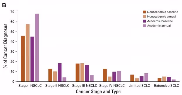 Figure B: Percentage of each stage and type of lung cancer diagnosed at nonacademic centers compared with academic centers.[/caption]Published in the respected Journal of Oncology Practice, the paper resulted from data collection from our Screening Centers of Excellence (SCOE) network. This is one of the first publications assessing workflow, outcomes, and barriers at community-based lung cancer screening sites.Our team analyzed survey data from our SCOE network of over 600 lung cancer screening programs committed to following best practice protocols during the first year of insurance coverage for lung cancer screening. The paper shares important information about an effective screening program framework that others may use to evaluate and improve their programs.While this data validates our SCOE network as a fundamental tool in defining high-quality and effective lung cancer screening, screening is still a relatively new practice which faces barriers. More than 50% of screening program representatives in the study reported that insurance and billing issues, lack of patient awareness about screening availability, internal workflow issues, and problems with provider referrals were barriers for their program. These findings highlight the immense value of our SCOE network, while also underlining the opportunity to address barriers and increase the impact of screening for our community.Congratulations to our science and research and excellence in screening and care teams for this major accomplishment.You can access the full publication for free! Click here to view or download.