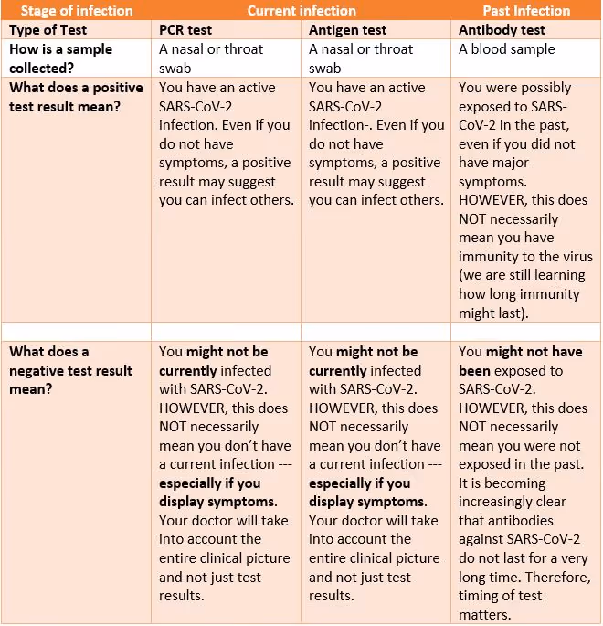 Should I get tested for COVID-19? Which test is right for me? What do the test results mean?If you or your loved one suspects that they have been exposed to SARS-CoV-2, and/or have developed the three most common COVID-19 symptoms (fever, cough, and shortness of breath), we recommend you get tested.Currently, three tests are available for COVID-19. The choice of test depends on whether you suspect that you have an active (existing) infection, or you were infected in the past and want to confirm infection.
