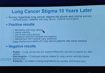 Lisa Carter-Harris, PhD, APRN, ANP-C[/caption]By Lisa Carter-Harris, PhD, APRN, ANP-C, Indiana University School of Nursing, Indianapolis, INThis year, I joined Lung Cancer Alliance in replicating a national survey, that was first done in 2008, to examine the perspectives of patients, oncologists and the general public on lung cancer. One aspect of the lung cancer experience captured by this effort involves the role stigma plays in the lives of those touched by this disease. The results will be unveiled today in Toronto, Canada at the IASLC 19th World Conference on Lung Cancer hosted by the International Association for the Study of Lung Cancer.While we would hope that the results would be a resounding decrease in patient reported lung cancer stigma, sadly this is not the case. In fact, the results reveal that even as public awareness about lung cancer increased over the last decade, an alarming increase in perceived stigma associated with this disease has also occurred. The reality of lung cancer stigma is tangible and has a profound impact on people living with this disease. The stigma of lung cancer is perpetuated by the public’s perception that this is a ‘smoker’s only’ disease even though we know that close to 20 percent of those diagnosed in the U.S. each year are actually people who have never smoked.It is certainly possible that this increase in recognition of stigma is reflective of more people feeling comfortable to report it, but the fact that the trend is an upward one is still concerning. This is particularly true given that we live in an era where early detection methods are readily available to diagnose lung cancer at earlier stages when it is most treatable.