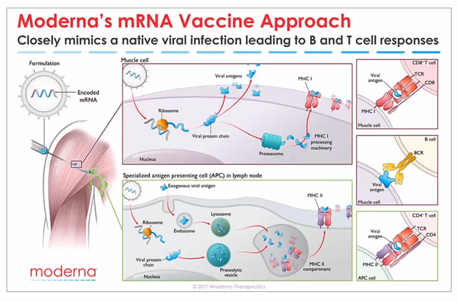 Messenger RNA (mRNA) is the recipe for making a protein. The mRNA gets injected into the body and is taken up by cells that “read the recipe” for making the SARS-CoV-2 spike protein. This is the protein normally expressed as a “crown” on the virus particle and is the part of the virus that binds to the receptor found on cells in the lungs and in other tissues throughout the body. Once these cells take up the mRNA and make the spike protein, they can display pieces of spike on their cell surface to signal the immune cells to become activated. B cells are a type of immune cells that make antibodies that can block virus binding. CD4 T cells support B cells to make antibodies while CD8 T cells can kill virus-infected cells. This is illustrated in the figure below for Moderna’s vaccine (though Pfizer/BioNTech’s vaccine works in the same manner).